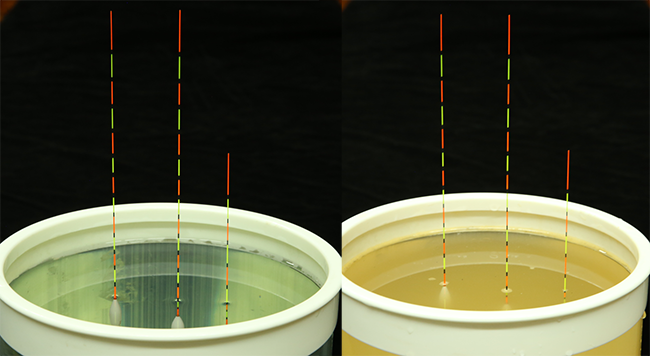 結(jié)論:不同的水體,雖然成分有變化,但對浮漂的影響非常細(xì)微,漂目上沒有變化,(在現(xiàn)實(shí)中,能夠讓魚類存活的水域,其水質(zhì)含有泥漿、鹽分等其他成分的濃度不可能非常高),所以,“漲目”跟水質(zhì)沒有關(guān)系。